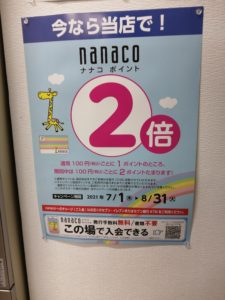 吉田店でご利用いただける「ナナコ」のポイントが2倍キャンペーン中! 対象期間は7/1~8/31までです。 この機会にぜひご利用ください。
